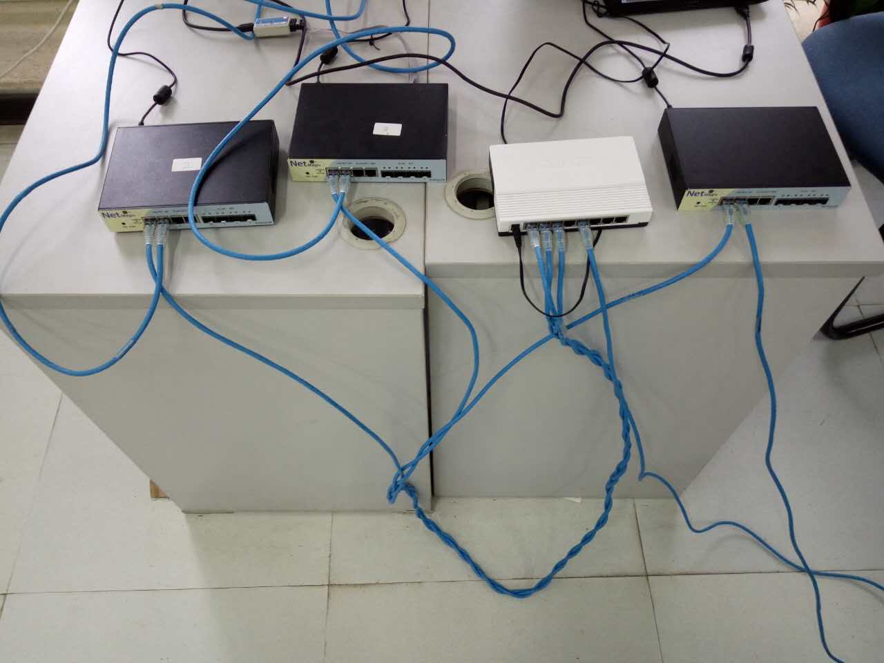 (6)floodlight控制器+3台NetMagic08设备软件适配代码都放到一台主机上(Ubuntu 14.04),并通过一根网线连接到交换机上。(这里特殊声明一下,由于主机不够,我们把控制器和软件适配代码都放到了一起)