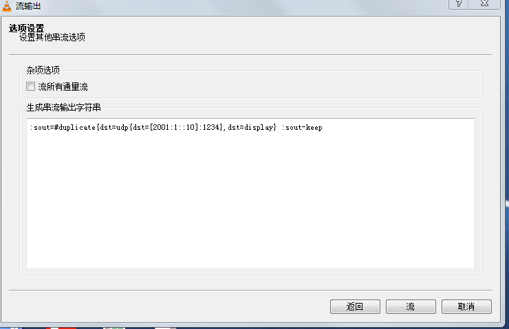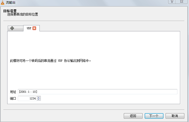 (4)接着点击(3)图中的【添加】选项,进入如下界面,在地址栏填写目标机的IP地址(在这里为视频接收端A2的地址),注意因为流的是ipv6地址,所以要加[]括号;端口默认1234,用户可随意更改。接着点击下一步