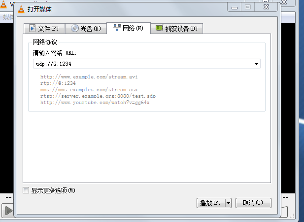 (7)在视频接收端A2机器中,打开VLC media player,选择【媒体】,接着选择【打开网络串流】,进入如图界面,在URL地址栏输入udp://@:1234,然后点击播放